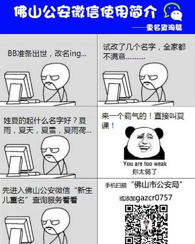 在為將要出生的BB改名而煩惱?想知道自己或者親友的姓名是不是很普遍?“佛山市公安局”微信可以幫到您!通過重名查詢服務(wù),就可以輕松達成您的愿望。