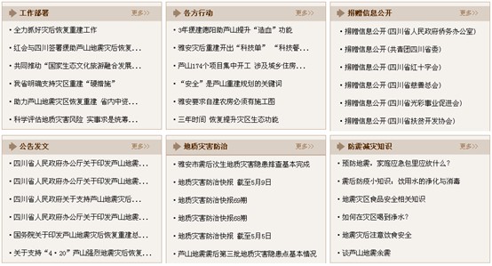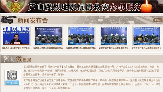 四川省人民政府網(wǎng)站在“4·20”蘆山地震中,第一時(shí)間制作專題,專題內(nèi)容實(shí)現(xiàn)7*24小時(shí)不間斷更新。及時(shí)公開政府第一手信息,內(nèi)容全面、透明、信息量大;欄目合理實(shí)用;內(nèi)容互動(dòng)性強(qiáng)。使政府信息在短時(shí)間內(nèi)形成抗災(zāi)救災(zāi)的合力,充分發(fā)揮了信息公開第一平臺(tái)、權(quán)威平臺(tái)的作用。