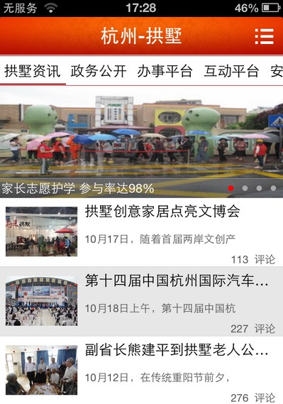?。?)打造移動門戶。當(dāng)前信息通信技術(shù)迅猛發(fā)展,信息網(wǎng)絡(luò)和智能終端迅速普及,手機(jī)網(wǎng)民迅速增加,為提高政府服務(wù)的高度,提供更好更舒適便捷的用戶體驗,加強(qiáng)“杭州?拱墅”門戶網(wǎng)站的覆蓋面,初步建設(shè)移動門戶,實現(xiàn)移動用戶(iOS平臺)實時訪問門戶網(wǎng)站內(nèi)容,并對安裝移動拱墅門戶推送相關(guān)重點信息,同時為智慧拱墅移動平臺搭建初步入口。杭州拱墅移動門戶(微門戶)客戶端,能夠及時發(fā)布“杭州?拱墅”的最新信息,內(nèi)容包含拱墅動態(tài)、政府信息公開、了解拱墅、網(wǎng)上辦事指南、政民互動等,支持微博推送分享、個性化訂閱、全文檢索功能,為公眾提供更快捷的服務(wù)。