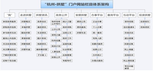 ?。?)進(jìn)一步優(yōu)化網(wǎng)站欄目架構(gòu)體系。2013年,“杭州?拱墅”門戶網(wǎng)站對網(wǎng)站欄目架構(gòu)體系進(jìn)行優(yōu)化,按照以“用戶為中心,服務(wù)為導(dǎo)向”的服務(wù)型政府網(wǎng)站建設(shè)宗旨,通過科學(xué)規(guī)劃、信息資源整合、共享,突出拱墅區(qū)資源特色,在網(wǎng)站欄目組織架構(gòu)、瀏覽便捷、頁面布局、搜索設(shè)置、內(nèi)容完整等方面進(jìn)行完善。通過優(yōu)化欄目架構(gòu)和服務(wù)體系,不斷提升網(wǎng)站的綜合水平,創(chuàng)新服務(wù)內(nèi)容和服務(wù)形式,提高“杭州?拱墅”門戶網(wǎng)站的服務(wù)深度。網(wǎng)站欄目優(yōu)化包括1個索引式導(dǎo)航和8個一級欄目、51個二級欄目,具體欄目體系的結(jié)構(gòu)如下圖所示: