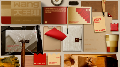 2024重新出發(fā)的大王椰,基于品牌一向氣派明亮的紅色系主調(diào)上,結(jié)合原木色形成組合配色,原來英文名“KING COCONUT”采用漢譯手法重新命名為"wang",且作為名稱第 一階層應(yīng)用,同時提取“wang”中的“W”作為超級符號,不僅打造出帶有W曲線的王冠狀新logo“板王標”,更將其延展到整體的視覺矩陣中,讓大王椰通過超級符號強化品牌在用戶心智中的“品質(zhì)為王”的年輕化形象認知。