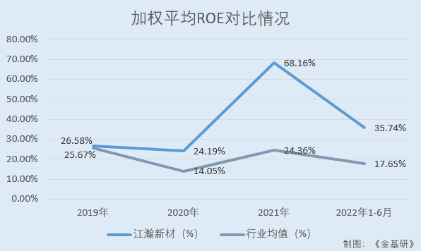經(jīng)金基研計(jì)算,2019-2021年及2022年1-6月,上述兩家江瀚新材同行業(yè)可比公司的加權(quán)平均ROE均值分別為25.67%、14.05%、24.36%、17.65%。