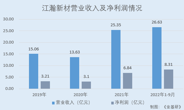 據(jù)招股書,2019-2021年,江瀚新材的營業(yè)收入分別為15.06億元、13.63億元、25.35億元,凈利潤分別為3.21億元、3.10億元、6.84億元。
