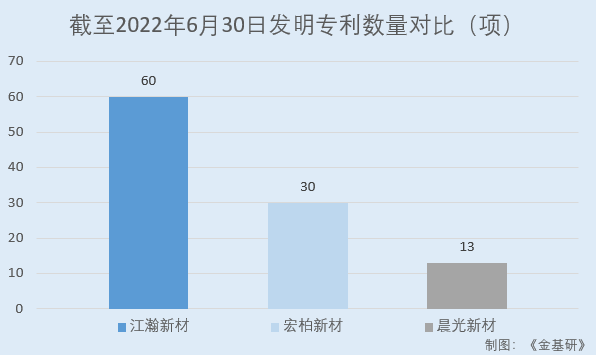 另據(jù)半年報(bào)數(shù)據(jù),截至2022年6月30日,江瀚新材同行業(yè)可比公司宏柏新材共獲得授權(quán)發(fā)明專利30項(xiàng);晨光新材擁有發(fā)明專利13項(xiàng)。