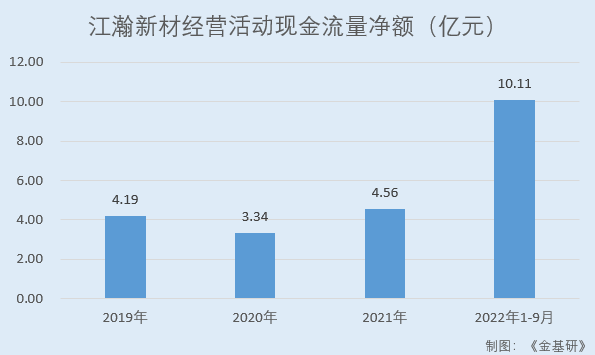 據(jù)招股書,2019-2021年及2022年1-9月,江瀚新材經(jīng)營活動(dòng)產(chǎn)生的現(xiàn)金流量凈額分別為4.19億元、3.34億元、4.56億元、10.11億元。