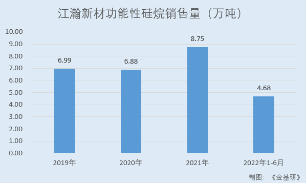 據(jù)招股書,2019-2021年及2022年1-6月,江瀚新材功能性硅烷銷售量分別為6.99萬噸、6.88萬噸、8.75萬噸、4.68萬噸。其中,2020年銷售量小幅下降主要系受新冠感冒影響。