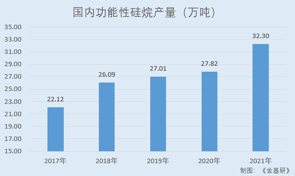 據(jù)SAGSI數(shù)據(jù),2017-2021年,國內(nèi)功能性硅烷產(chǎn)量分別為22.12萬噸、26.09萬噸、27.01萬噸、27.82萬噸、32.30萬噸,占全球產(chǎn)量市場份額分別為58.83%、62.87%、61.53%、64.10%、67.57%。