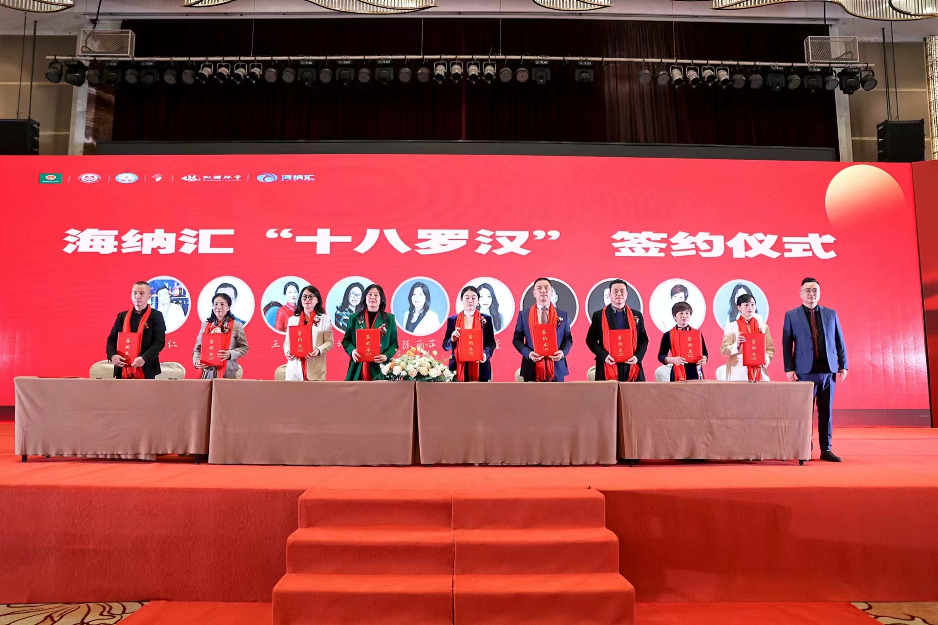 本次活動的協(xié)辦單位海納匯(福建)文化傳播有限公司CEO賈茗豪先生率領(lǐng)創(chuàng)始股東“18羅漢”登場進(jìn)行簽約和授刀儀式。