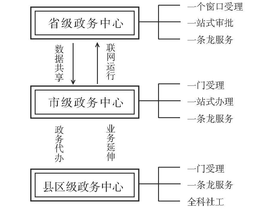 二是建立線下運(yùn)營(yíng)模式。線下布局就是在各個(gè)地區(qū)建立各級(jí)的政務(wù)中心, 以網(wǎng)絡(luò)平臺(tái)為基礎(chǔ), 以具體便民業(yè)務(wù)為抓手, 有效提升了政府工作效率和政府為民服務(wù)的能力, 按照行政區(qū)域的劃分, 我國(guó)政務(wù)中心可以分為省級(jí)、市級(jí)、縣區(qū)級(jí)三個(gè)級(jí)別, 把打造集行政審批、電子監(jiān)察、績(jī)效管理、便民服務(wù)等功能為一體的政務(wù)平臺(tái)為努力方向, 實(shí)現(xiàn)網(wǎng)上窗口與審批系統(tǒng)、監(jiān)察系統(tǒng)的有效銜接和跟進(jìn)數(shù)據(jù)同步, 充分利用大數(shù)據(jù)的優(yōu)勢(shì)強(qiáng)化政府效能。具體構(gòu)建如圖6所示。