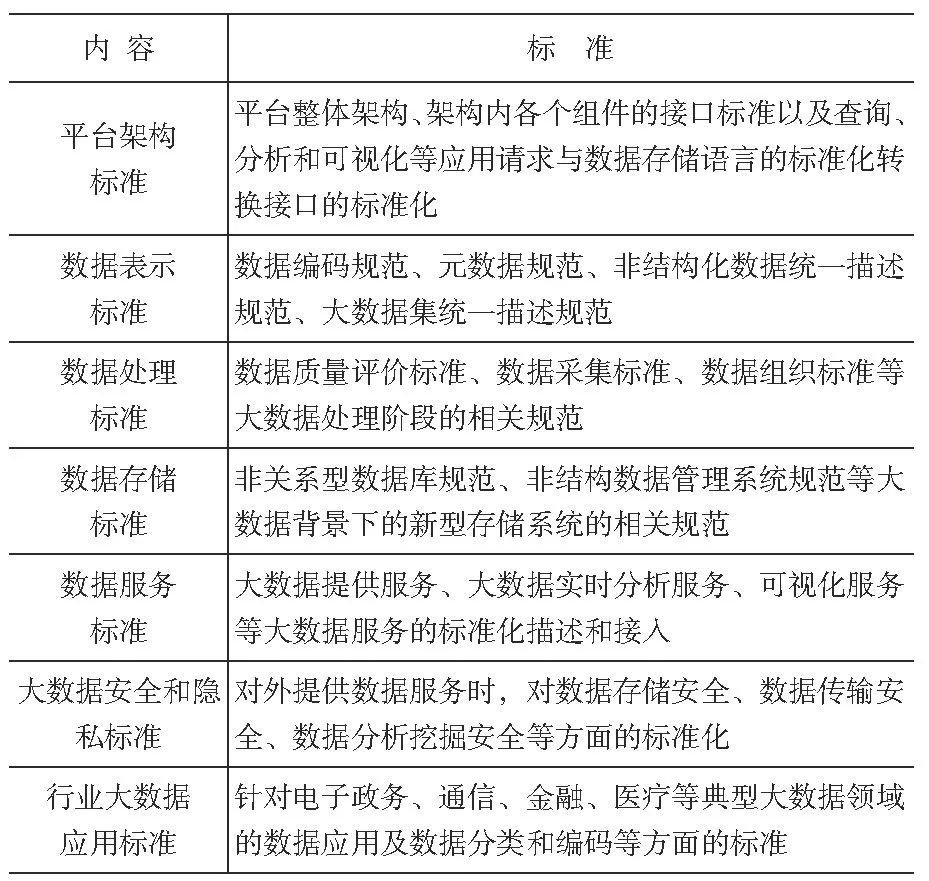 三是制定統(tǒng)一的數(shù)據(jù)規(guī)范標(biāo)準(zhǔn)。目前, 我國(guó)政府?dāng)?shù)據(jù)開放門戶網(wǎng)站以及相關(guān)的軟件和技術(shù)都是政府采購(gòu), 各個(gè)廠商之間自主開放, 各個(gè)部門自主進(jìn)行選擇, 這就會(huì)導(dǎo)致數(shù)據(jù)的格式和技術(shù)標(biāo)準(zhǔn)上的不統(tǒng)一。因此, 必須建立規(guī)范的數(shù)據(jù)標(biāo)準(zhǔn)和統(tǒng)一數(shù)據(jù)口徑, 具體構(gòu)建標(biāo)準(zhǔn)見表1。