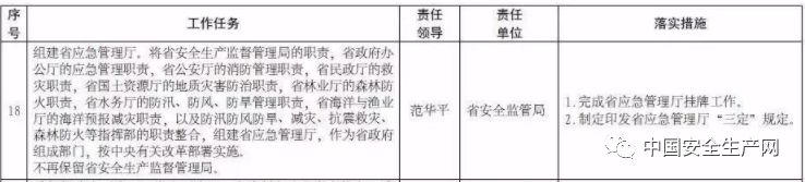《改革方案》中將海南省安全生產(chǎn)監(jiān)督管理局的職責(zé),省政府辦公廳的應(yīng)急管理職責(zé),省公安廳的消防管理職責(zé),省民政廳的救災(zāi)職責(zé),省國(guó)土資源廳的地質(zhì)災(zāi)害防治職責(zé),省林業(yè)廳的森林防火職責(zé),省水務(wù)廳的防汛、防風(fēng)、防旱管理職責(zé),省海洋與漁業(yè)廳的海洋預(yù)報(bào)減災(zāi)職責(zé),以及防汛防風(fēng)防旱、減災(zāi)、抗震救災(zāi)、森林防火等指揮部的職責(zé)整合,組建省應(yīng)急管理廳,作為省政府組成部門,按中央有關(guān)改革部署實(shí)施。