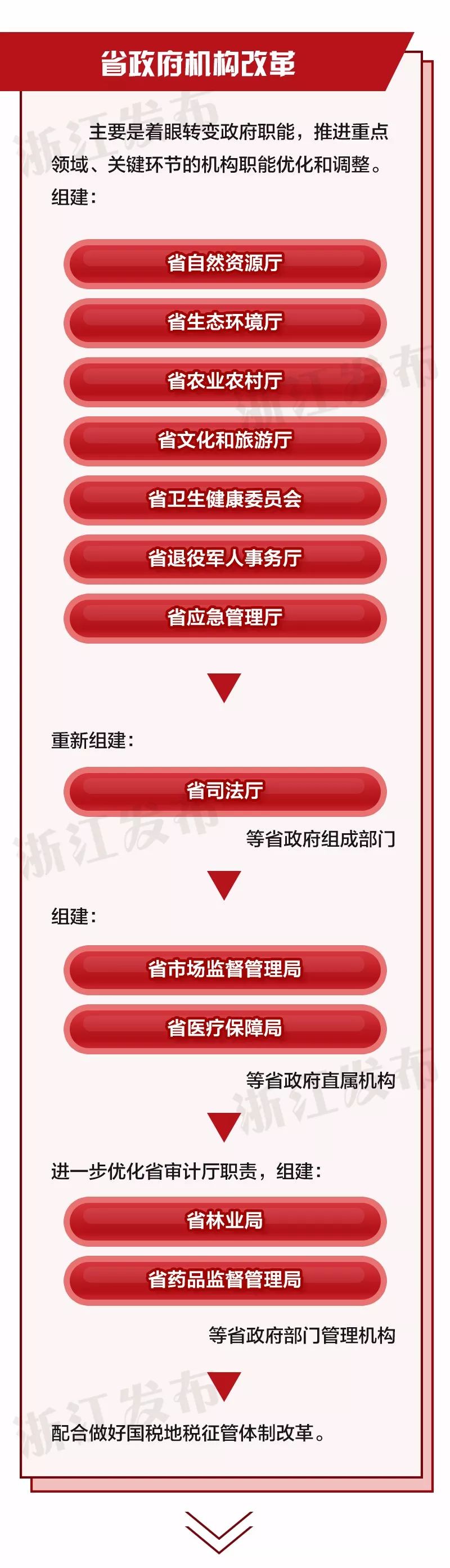 深化機(jī)構(gòu)改革,要認(rèn)真貫徹落實(shí)習(xí)近平總書記對浙江工作的重要指示精神,按照“干在實(shí)處永無止境,走在前列要謀新篇,勇立潮頭方顯擔(dān)當(dāng)”要求,從機(jī)構(gòu)職能上把加強(qiáng)黨的領(lǐng)導(dǎo)落實(shí)到各領(lǐng)域各方面各環(huán)節(jié),省市縣主要機(jī)構(gòu)設(shè)置同中央保持基本對應(yīng);以深化“最多跑一次”改革為牽引,加快政府職能轉(zhuǎn)變,使市場在資源配置中起決定性作用、更好發(fā)揮政府作用,強(qiáng)化社會管理和公共服務(wù)職能,切實(shí)解決人民群眾最關(guān)心最直接最現(xiàn)實(shí)的利益問題;統(tǒng)籌省市縣鄉(xiāng)各層級、黨政群各領(lǐng)域改革,優(yōu)化機(jī)構(gòu)設(shè)置和職能配置,提高效率效能;充分發(fā)揮法治規(guī)范和保障改革作用,在改革中完善和強(qiáng)化法治,堅(jiān)決維護(hù)國家法制統(tǒng)一、政令統(tǒng)一、市場統(tǒng)一;結(jié)合浙江實(shí)際,因地制宜,大膽探索機(jī)構(gòu)設(shè)置和職能配置,構(gòu)建系統(tǒng)完備、科學(xué)規(guī)范、運(yùn)行高效的機(jī)構(gòu)職能體系,再創(chuàng)體制機(jī)制新優(yōu)勢,為推進(jìn)“八八戰(zhàn)略”再深化、改革開放再出發(fā),加快浙江高水平全面建成小康社會、高水平推進(jìn)社會主義現(xiàn)代化建設(shè)提供堅(jiān)強(qiáng)有力的體制機(jī)制保障。
