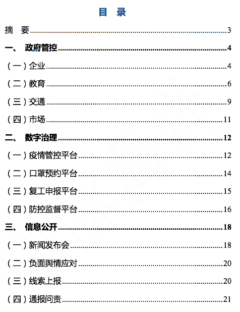 摘要:新冠肺炎疫情發(fā)生以來,浙江各級政府和人民全力以赴抗擊疫情。全省動員、全面部署、快速反應(yīng),采取了最全面、最嚴格的防控舉措,打響了一場疫情防控的人民戰(zhàn)爭。本報告采集浙江省本級和11個地級市的疫情防控相關(guān)數(shù)據(jù),從政府管控、數(shù)字治理、信息公開三個維度進行數(shù)據(jù)采集、分析,總體來看浙江省各級政府在企業(yè)、教育、交通、市場等領(lǐng)域均開展了相關(guān)防疫工作措施,通過全省政務(wù)服務(wù)平臺渠道快速搭建了相關(guān)疫情服務(wù)平臺,提供疫情信息發(fā)布、疫情線索申報、醫(yī)療服務(wù)、同行程人員查詢、口罩預(yù)約等服務(wù),同時各級政府也通過新聞發(fā)布會等形式及時公布疫情信息,辟謠并查處違法行為等。
