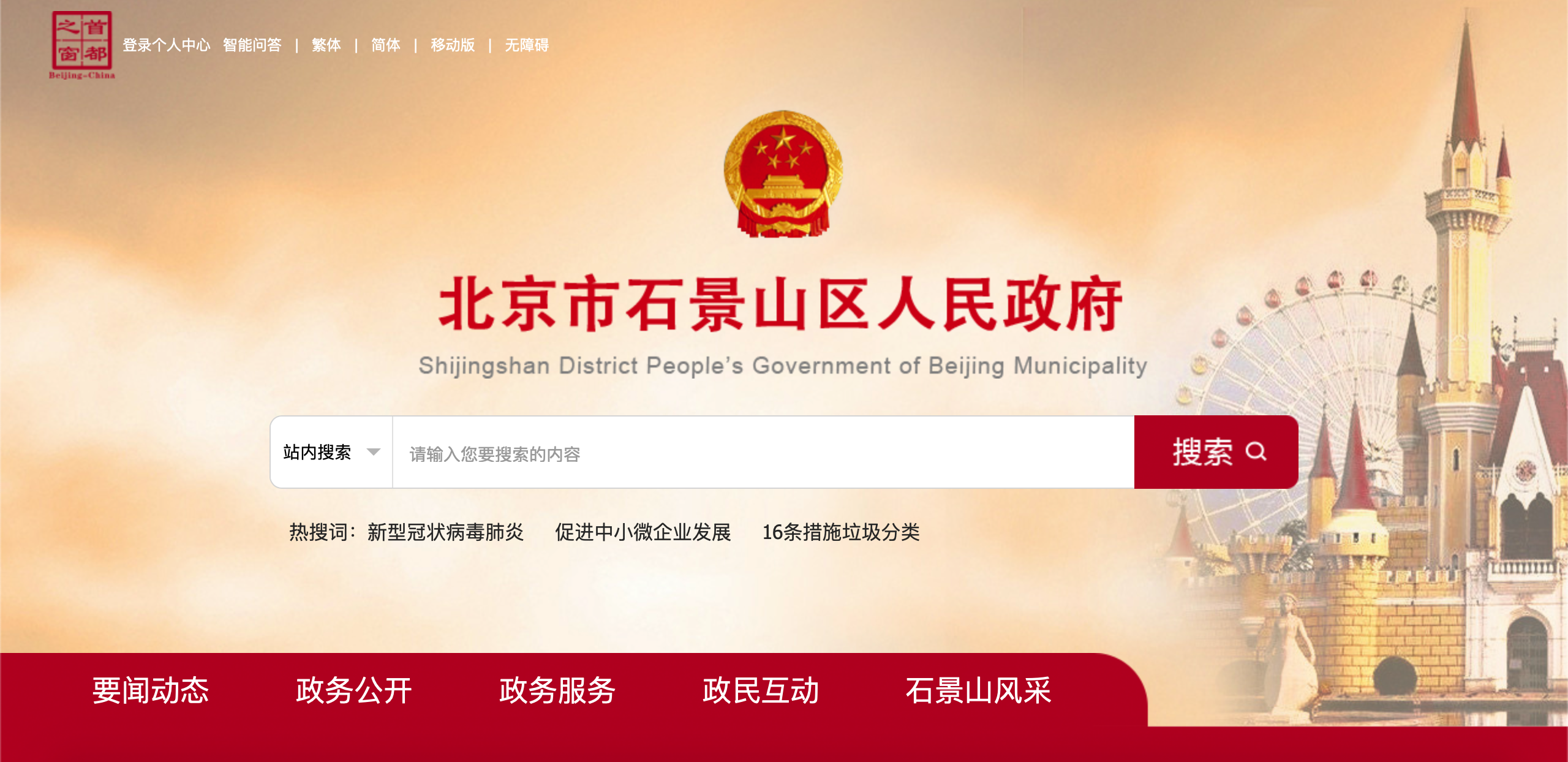 兩個(gè)區(qū)政府網(wǎng)站使用了現(xiàn)代建筑、場(chǎng)所的形象,其中,石景山區(qū)政府網(wǎng)站右側(cè)使用石景山游樂(lè)園的城堡和摩天輪形象;懷柔區(qū)政府網(wǎng)站首屏在右側(cè)使用了雁棲湖國(guó)際會(huì)展中心的形象。