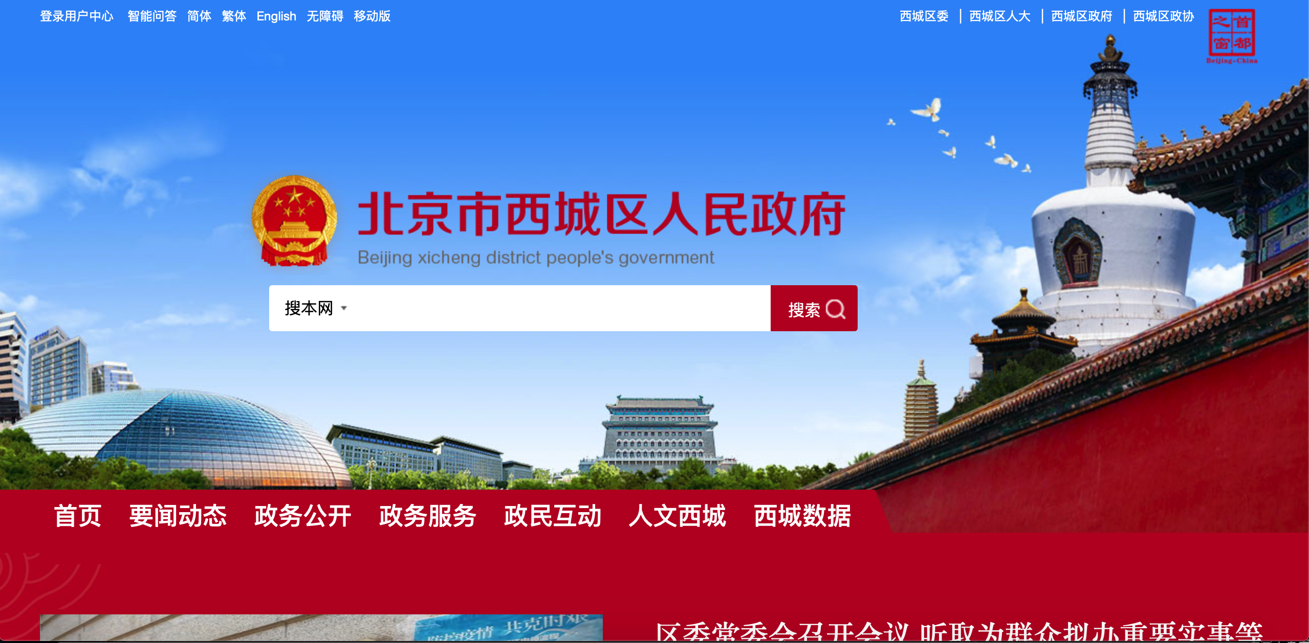 西城區(qū)政府網(wǎng)站使用的形象較多,包括紅墻、白塔、正陽(yáng)門、國(guó)家大劇院等多個(gè)建筑形象。