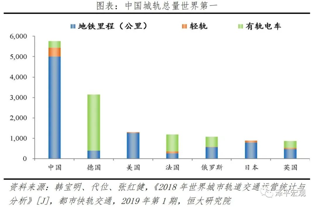 4)城軌:中國軌道交通里程居世界第一,人均高于美國,但低于日英法德俄。按照國際較為常用的分類方法,城軌分為地鐵、輕軌和有軌電車三類,從總量上看,根據(jù)《2018年世界城市軌道交通運(yùn)營統(tǒng)計(jì)與分析》,我國城軌里程共計(jì)5766.7公里,位居世界第一,占全球總里程的22.09%;其中地鐵、輕軌和有軌電車?yán)锍谭謩e為5013.3、420.8和332.6公里,分別占全球地鐵和輕軌里程的35.3%、32.5%和3.1%,地鐵、輕軌里程也是世界第一。但從人均來看,中國人均城軌里程4.1公里/百萬人,高于美國的4.0,但低于日本的7.0、英國的13.1、法國17.7、德國的38.0和俄羅斯的7.5。