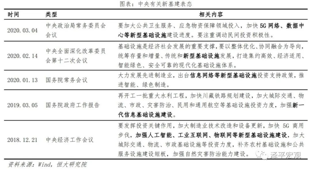 中央近期密集點(diǎn)名新基建,其內(nèi)涵不應(yīng)局限在信息領(lǐng)域。新基建在2018年12月中央經(jīng)濟(jì)工作會(huì)議被第一次提及,2019年寫入國務(wù)院政府工作報(bào)告,2020年1月國務(wù)院常務(wù)會(huì)議、2月中央深改委會(huì)議、3月中央政治局常委會(huì)議持續(xù)密集部署。從中央會(huì)議內(nèi)容看,新基建側(cè)重于5G網(wǎng)絡(luò)、數(shù)據(jù)中心、人工智能、工業(yè)互聯(lián)網(wǎng)、物聯(lián)網(wǎng)等新一代信息技術(shù)。