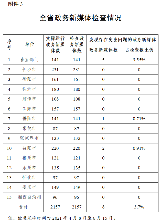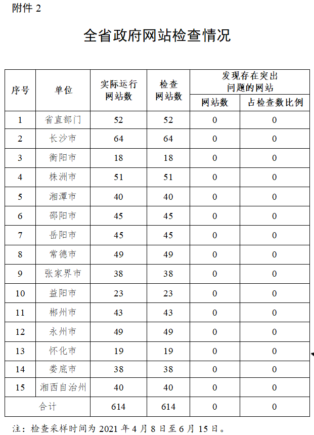 2021年第二季度,省政務(wù)局組織對(duì)全省正常運(yùn)行的614家政府網(wǎng)站進(jìn)行全覆蓋檢查,無存在突出問題政府網(wǎng)站,總體檢查合格率100%。重點(diǎn)檢查了50家省直單位網(wǎng)站互動(dòng)交流功能,其中省長信箱欄目有32家單位、部門直通車欄目有20家單位實(shí)現(xiàn)了對(duì)簡單常見咨詢問題1個(gè)工作日內(nèi)準(zhǔn)確答復(fù)(詳見附表1)。對(duì)全省正常運(yùn)行的2157家政務(wù)新媒體進(jìn)行普查,發(fā)現(xiàn)8家存在單項(xiàng)否決問題,總體合格率99.63%,其中長沙市、衡陽市、株洲市、湘潭市、邵陽市、常德市、張家界市、郴州市、永州市、懷化市、婁底市、湘西自治州政務(wù)新媒體檢查合格率100%。