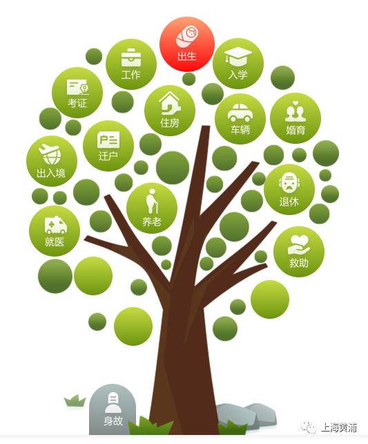 針對(duì)企業(yè)群眾的這些共性需求問(wèn)題,黃浦區(qū)結(jié)合近年來(lái)“一網(wǎng)通辦”改革的實(shí)踐經(jīng)驗(yàn),在“高效辦成一件事”的基礎(chǔ)上,于4月15日在“一網(wǎng)通辦”上線了政務(wù)服務(wù)集成導(dǎo)航兩棵“生命樹(shù)”。采用可視化圖標(biāo)分類,向企業(yè)群眾直觀體現(xiàn)全生命周期可能需辦理的政務(wù)服務(wù)事項(xiàng)。