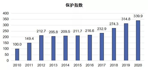 從報告評價結果來看,自《國家知識產(chǎn)權戰(zhàn)略綱要》(以下簡稱《綱要》)實施以來,特別是黨的十八大以來,我國知識產(chǎn)權綜合實力實現(xiàn)了快速躍升,2020年全國知識產(chǎn)權綜合發(fā)展指數(shù)從2010的基期值100提升至304.7,年均增速11.8%。體現(xiàn)出以下四個方面的特征:一是知識產(chǎn)權創(chuàng)造能力顯著提升,全國知識產(chǎn)權創(chuàng)造指數(shù)從2010年基期值100增至2020年296.5,年均增速達到11.5%,知識產(chǎn)權創(chuàng)造產(chǎn)出快速增長,創(chuàng)造質量和效率均得到穩(wěn)步提升。二是知識產(chǎn)權運用效益加速顯現(xiàn),全國知識產(chǎn)權運用指數(shù)從2010年基期值100增至2020年267.4,年均增速達到10.3%,知識產(chǎn)權運用規(guī)模逐步加大、運用效益大幅提升。三是知識產(chǎn)權保護水平全面加強,全國知識產(chǎn)權保護指數(shù)從2010年基期值100增至2020年339.9,年均增速達到13.0%,我國知識產(chǎn)權司法保護力度不斷加大、行政保護全面加強、知識產(chǎn)權保護效果顯著。四是知識產(chǎn)權制度環(huán)境大幅改善,全國知識產(chǎn)權環(huán)境指數(shù)從2010年基期值100增至2020年315.3,年均增速達到12.2%,知識產(chǎn)權法律制度體系不斷完善、知識產(chǎn)權服務能力大幅提升、知識產(chǎn)權保護意識明顯加強。綜合判斷,《綱要》提出的“到2020年,把我國建設成為知識產(chǎn)權創(chuàng)造、運用、保護和管理水平較高的國家”這一目標已經(jīng)實現(xiàn)。