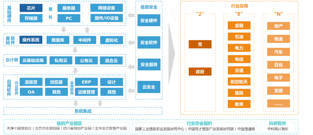 從產(chǎn)業(yè)鏈角度看,信創(chuàng)生態(tài)體系主要由基礎(chǔ)硬件、基礎(chǔ)軟件、應(yīng)用軟件、信息安全及云計算平臺幾部分組成。