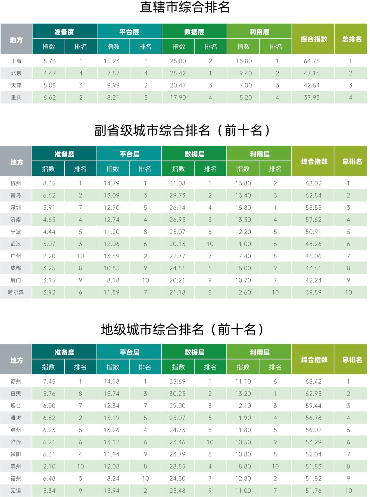 四個(gè)直轄市開放數(shù)林指數(shù)分值和排名如下表所示,上海市綜合表現(xiàn)最優(yōu),位列第一。
