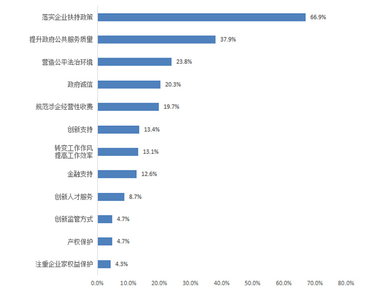 調查結果顯示,企業(yè)最希望政府改進和優(yōu)化營商環(huán)境的方面主要有落實企業(yè)扶持政策、提升政府公共服務質量、營造公平法治環(huán)境,占比分別為66.9%、37.9%、23.8%(詳見下圖)。
