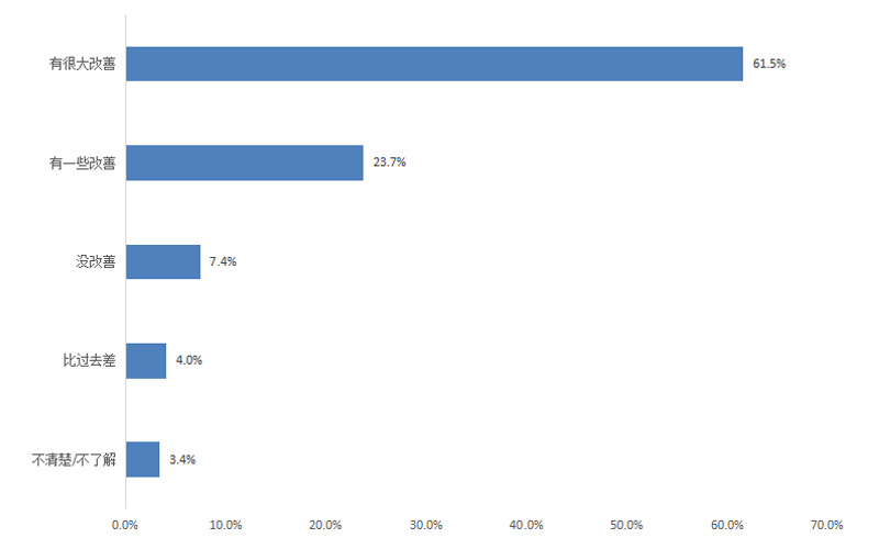 《遼寧省紀委監(jiān)委營商環(huán)境監(jiān)督行動方案》實施一年來,全省營商環(huán)境明顯改善,企業(yè)滿意度處于較高水平。調查結果顯示,企業(yè)對所在地營商環(huán)境整體改善情況持正向評價的為85.2%(“有很大改善”和“有一些改善”比重之和),其中評價“有很大改善”的占61.5%,“有一些改善”的占23.7%,“沒改善”的占7.4%,“比過去差”的占4.0%,“不清楚/不了解”的占3.4%。