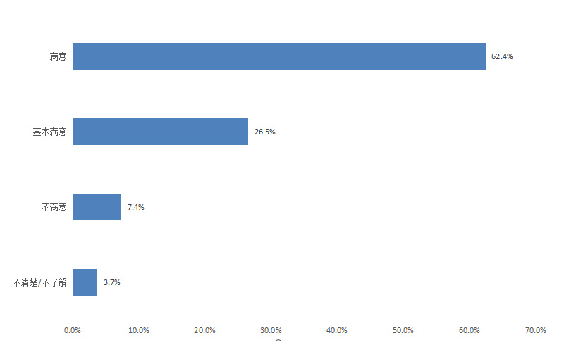 調查結果顯示,群眾對政府機關工作人員的工作作風的滿意度為88.9%,其中評價“滿意”的占62.4%,“基本滿意”的占26.5%,“不滿意”的占7.4%,“不清楚/不了解”的占3.7%。