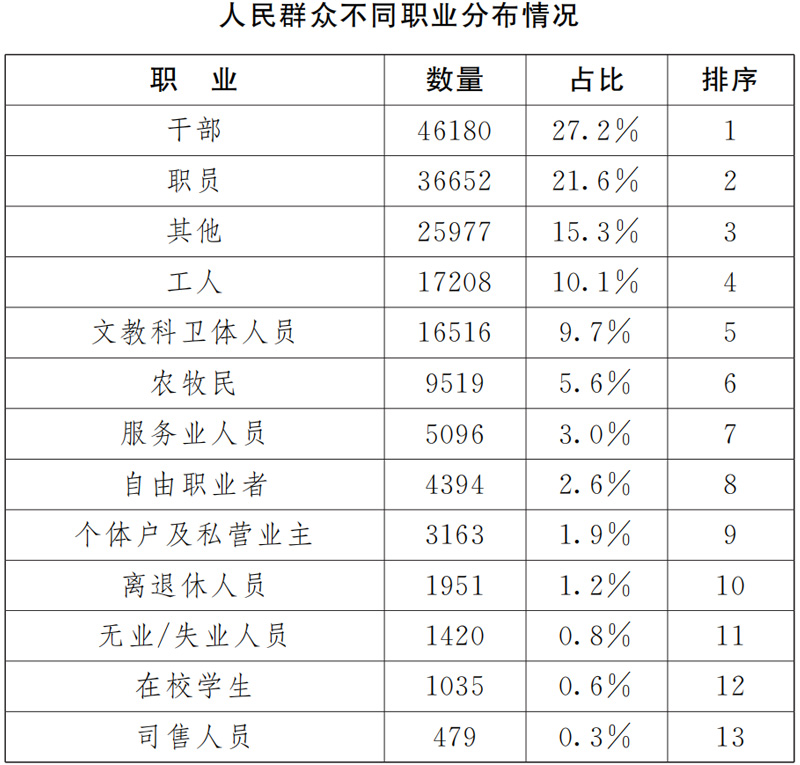 職業(yè)構成分布情況:職業(yè)分布中,調查數(shù)量最多的是干部,為46180人,占比27.2%;最少的是司售人員,為479人,占比0.3%(詳見下表)。