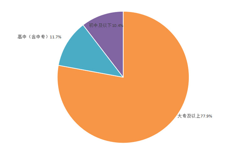 學歷構成情況:初中及以下17659人,占10.4%;高中(含中專)19824人,占11.7%;大專及以上132106人,占77.9%。
