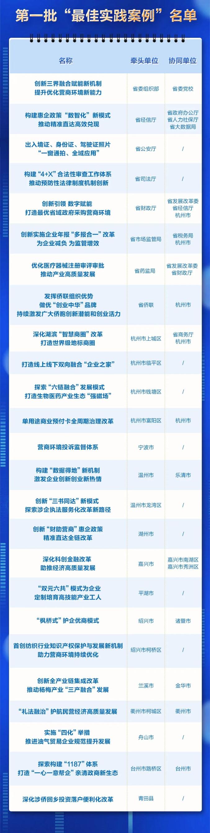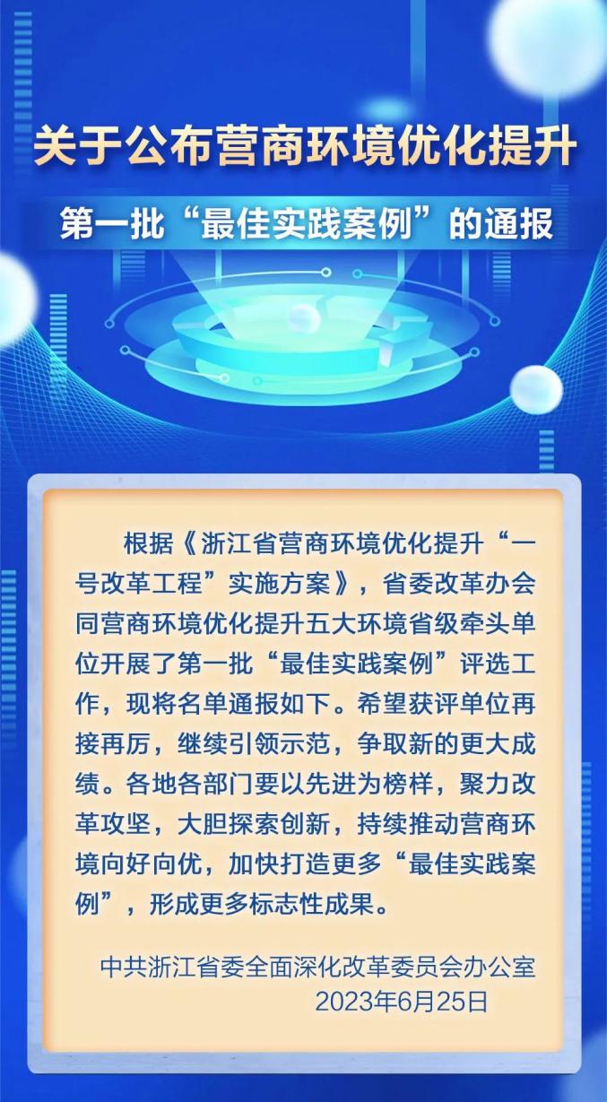 根據(jù)《浙江省營(yíng)商環(huán)境優(yōu)化提升“一號(hào)改革工程”實(shí)施方案》,省委改革辦會(huì)同營(yíng)商環(huán)境優(yōu)化提升五大環(huán)境省級(jí)牽頭單位,對(duì)第一批“最佳實(shí)踐案例”進(jìn)行了評(píng)選,名單如下。