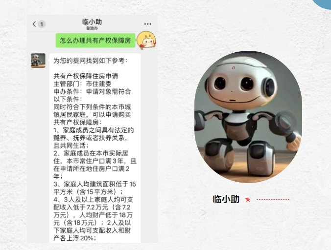 居民區(qū)一線需要的數(shù)據(jù)超過50%來自業(yè)務系統(tǒng),彭浦新村街道將相關政務數(shù)據(jù)歸集到區(qū)政務數(shù)據(jù)共享平臺,確定了“街道提出申請、區(qū)數(shù)據(jù)管理部門審核、業(yè)務數(shù)據(jù)提供方供應數(shù)據(jù)”的模式。臨汾路街道推出了ai對話機器人“臨小助”,收錄了公安、民政、人社、房管等15個部門198項面向居民的服務類政策。以居民查詢如何申請共有產權保障房為例,居民區(qū)社工現(xiàn)在只需拿出手機,在微信中找到ai對話機器人“臨小助”,輸入“怎么辦理共有產權保障房”,一秒鐘就得到了經(jīng)過整理條理清晰的答案。