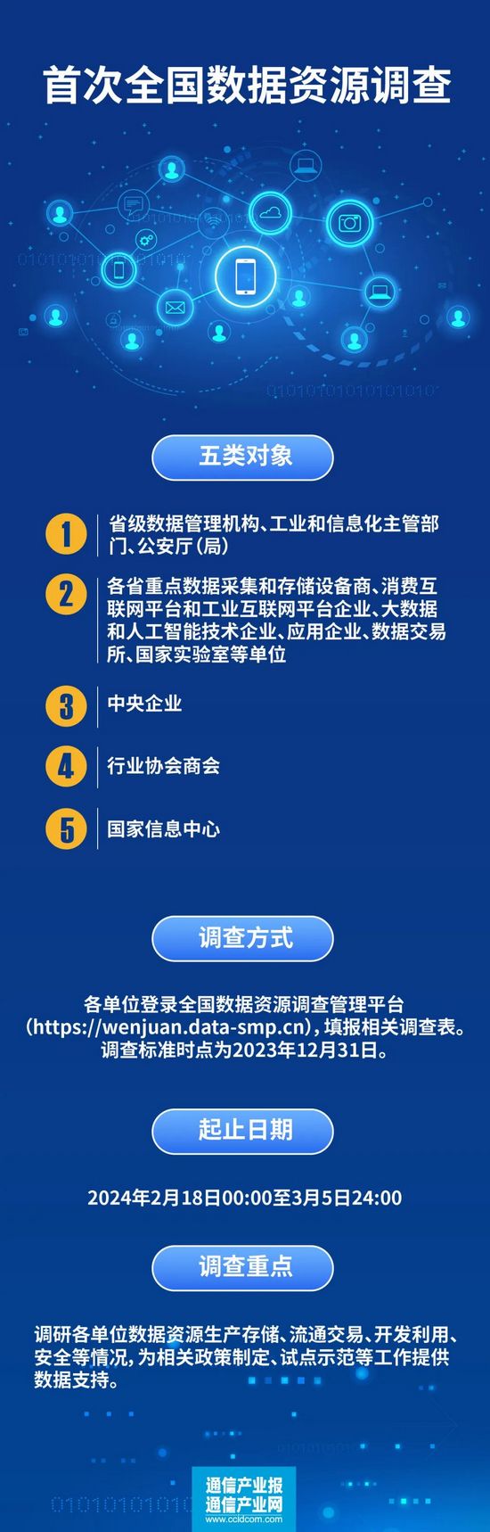 2月19日,國(guó)家數(shù)據(jù)局、中央網(wǎng)絡(luò)安全和信息化委員會(huì)辦公室、工業(yè)和信息化部、公安部聯(lián)合發(fā)出通知,為貫徹落實(shí)《數(shù)字中國(guó)建設(shè)整體布局規(guī)劃》工作部署,摸清數(shù)據(jù)資源底數(shù),加快數(shù)據(jù)資源開(kāi)發(fā)利用,更好發(fā)揮數(shù)據(jù)要素價(jià)值,四部門(mén)開(kāi)展全國(guó)數(shù)據(jù)資源情況調(diào)查,調(diào)研各單位數(shù)據(jù)資源生產(chǎn)存儲(chǔ)、流通交易、開(kāi)發(fā)利用、安全等情況,為相關(guān)政策制定、試點(diǎn)示范等工作提供數(shù)據(jù)支持。