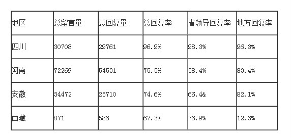 筆者對(duì)留言板上各地區(qū)總留言量、總回復(fù)量的統(tǒng)計(jì)顯示,四川、河南、安徽三省在總回復(fù)率、領(lǐng)導(dǎo)回復(fù)率、地方回復(fù)率的排名中均位列前四位??梢猿醪秸J(rèn)定,這三個(gè)省網(wǎng)民對(duì)平臺(tái)的關(guān)注度、地方政府的重視程度相對(duì)較高,平臺(tái)運(yùn)行績(jī)效相對(duì)較好。在選擇案例研究時(shí),筆者也將主要從此三省的留言處理案例中進(jìn)行選擇并分析。下表列出了總回復(fù)率排名前4位地區(qū)的幾項(xiàng)數(shù)據(jù)(篇幅有限,其他地區(qū)不在此列出)