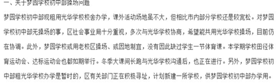 這則留言最后將矛頭指向高新區(qū)對(duì)于教育投入的不足,并根據(jù)《中華人民共和國(guó)義務(wù)教育法》指出高新區(qū)管委會(huì)在學(xué)校規(guī)劃和設(shè)置事項(xiàng)上的不作為。2月17日,高新區(qū)工委辦公室在網(wǎng)上回復(fù),表示由管委會(huì)出資租用光華學(xué)校操場(chǎng)用于夢(mèng)園學(xué)校辦學(xué)。