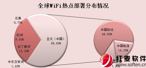 作為移動(dòng)互聯(lián)網(wǎng)的一支生力軍,加強(qiáng)WiFi網(wǎng)絡(luò)的覆蓋可謂備受關(guān)注。ABI Research顯示,在全球WiFi熱點(diǎn)部署中,68.6%的WiFi熱點(diǎn)在亞太地區(qū)部署,拉丁美洲占了12.3%,歐洲占了9%,北美占了8.7%,中東及非洲地區(qū)則僅有1.4%。在亞太地區(qū),僅中國就已部署了62萬個(gè)WiFi熱點(diǎn)。其中,中國移動(dòng)已建設(shè)了42萬個(gè)WiFi熱點(diǎn),占比46.50%;中國電信部署了12.8萬個(gè)熱點(diǎn),占比14.20%;中國聯(lián)通部署了7.2萬個(gè),占比7.90%。
