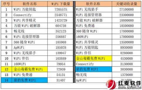 從WiFi關(guān)鍵詞搜錄量來看,WiFi無線獵手占比最最高;其次是WiFi鏈接管理器;再次是萬能WiFi破解器。