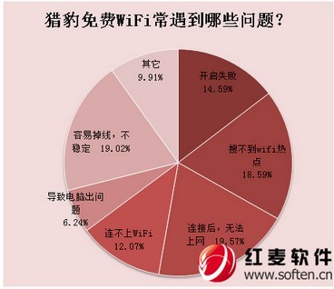 雖然獵豹免費(fèi)WiFi發(fā)布2.0正式版,支持90%以上校園網(wǎng),首創(chuàng)個(gè)性歡迎頁,并完美包養(yǎng)市面上所有的隨身WiFi,將獵豹免費(fèi)WiFi獨(dú)創(chuàng)的防蹭網(wǎng)、設(shè)備限速、定時(shí)關(guān)機(jī)、中文名等WiFi拓展功能發(fā)揮到極致,但19.57%用戶反映稱,連接后無法上網(wǎng);還有18.59%的用戶反映搜不到WiFi熱點(diǎn)。