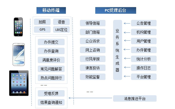 平臺(tái)支持信息推送技術(shù),"辦件"的辦理狀態(tài)和結(jié)果可以通過(guò)云端的消息中心推送至移動(dòng)終端告知用戶,便于用戶能夠及時(shí)準(zhǔn)確地了解其遞交辦件的辦理進(jìn)程,并對(duì)其結(jié)果及時(shí)查看,并免去了短信資費(fèi)。