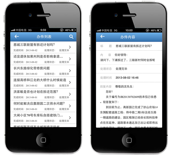 通過(guò)移動(dòng)終端可以實(shí)時(shí)查看辦件列表,關(guān)注自己提交的辦件或是他人提交辦件處理的情況。充分知情政民交互的內(nèi)容,可以方便地瀏覽熱點(diǎn)處理信息和常見(jiàn)問(wèn)題信息。