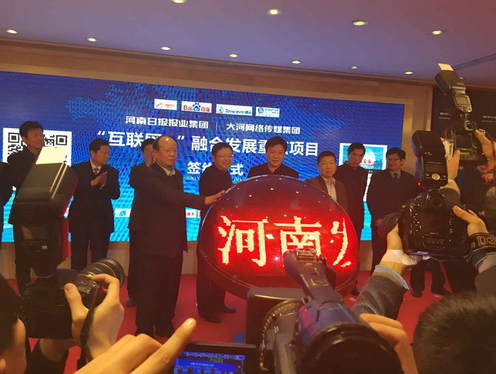 河南省委宣傳部副部長、河南日?qǐng)?bào)報(bào)業(yè)集團(tuán)黨委書記、董事長、社長趙鐵軍,河南省委宣傳部副部長王仁海,河南省人民政府辦公廳副主任張書欣,騰訊集團(tuán)公共戰(zhàn)略研究部總經(jīng)理司曉共同開通“河南發(fā)布”微信公眾平臺(tái)。
