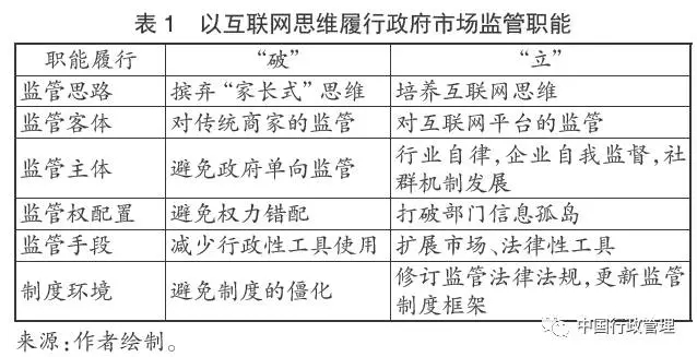 在“互聯(lián)網(wǎng)+”時代,建立健全市場經(jīng)濟體制的長期任務面臨著新的挑戰(zhàn)和機遇。信息獲取、傳遞、記錄和處理的成本降低,對不同主體間的信息不對稱情況產(chǎn)生影響,從而需要政府市場監(jiān)管做出應對。在此過程中,如何運用互聯(lián)網(wǎng)思維,有效發(fā)揮監(jiān)管職能的同時減少過度干預對市場規(guī)律的破壞,已經(jīng)成為新時代監(jiān)管型政府必須回答的重要議題。站在“互聯(lián)網(wǎng)+”的風口,政府市場監(jiān)管職能的履行,不僅需要政府培養(yǎng)起互聯(lián)網(wǎng)思維,而且需要在現(xiàn)有監(jiān)管體系基礎上做到“破”與“立”(如表1所示),從而重構當代市場監(jiān)管職能體系,走向“互聯(lián)網(wǎng)+”時代的監(jiān)管型政府。
