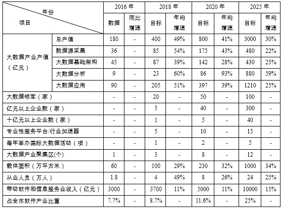 產(chǎn)業(yè)基礎(chǔ)夯實(shí)期(2017-2018年),重點(diǎn)推進(jìn)大數(shù)據(jù)基礎(chǔ)設(shè)施建設(shè)、數(shù)據(jù)管理機(jī)制完善和大數(shù)據(jù)龍頭企業(yè)引培等工作。到2018年,大數(shù)據(jù)支撐體系基本建成,編制形成2項(xiàng)大數(shù)據(jù)標(biāo)準(zhǔn),建成不少于5個(gè)專業(yè)性大數(shù)據(jù)服務(wù)平臺(tái)和行業(yè)加速器;大數(shù)據(jù)供給能力大幅增強(qiáng),招引大數(shù)據(jù)領(lǐng)軍企業(yè)不少于20家,收入超億元的大數(shù)據(jù)企業(yè)超過(guò)5家,推動(dòng)大數(shù)據(jù)重點(diǎn)項(xiàng)目不少于40個(gè);政務(wù)大數(shù)據(jù)服務(wù)采購(gòu)機(jī)制基本形成,累計(jì)開(kāi)展不少于6項(xiàng)行業(yè)大數(shù)據(jù)應(yīng)用示范。大數(shù)據(jù)產(chǎn)業(yè)產(chǎn)值達(dá)到400億元。