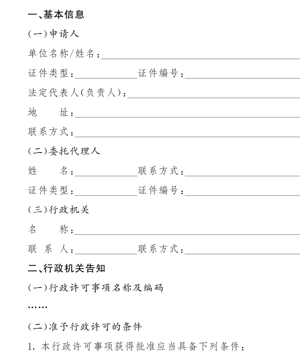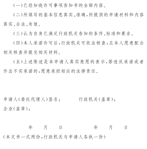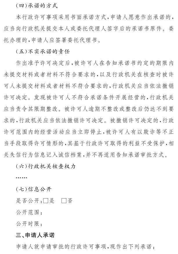 (三)制定具體工作規(guī)程。省直有關(guān)部門要會同市縣相關(guān)部門按照全面準(zhǔn)確、權(quán)責(zé)清晰的要求,對本系統(tǒng)內(nèi)實行告知承諾制的涉企經(jīng)營許可事項,逐項編制告知承諾具體工作規(guī)程,明確實行告知承諾制的許可條件、許可材料、證明事項,制作告知承諾書格式文本(附件2),科學(xué)制定核查機(jī)制和監(jiān)管措施。行政機(jī)關(guān)應(yīng)當(dāng)按照精簡、明確、便利的要求,修訂完善辦事指南,在辦事指南中依法準(zhǔn)確列出辦理實行告知承諾制的涉企經(jīng)營許可事項的許可條件、需要提交的材料、可以減省的材料等,不得含有如“法律法規(guī)規(guī)定的其他條件”“政府部門認(rèn)為必要的其他條件”之類的兜底性條款。告知承諾制辦事指南、告知承諾書格式文本要通過辦事大廳、門戶網(wǎng)站和江西一體化政務(wù)服務(wù)平臺等渠道公布,方便申請人查閱、索取及下載。對因企業(yè)承諾可以減省的審批材料,不再要求企業(yè)當(dāng)場提供;對可在企業(yè)領(lǐng)證之后補交的審批材料,實行容缺受理、限期補交。能夠提供電子證照的,原則上免于提交實體證照。
