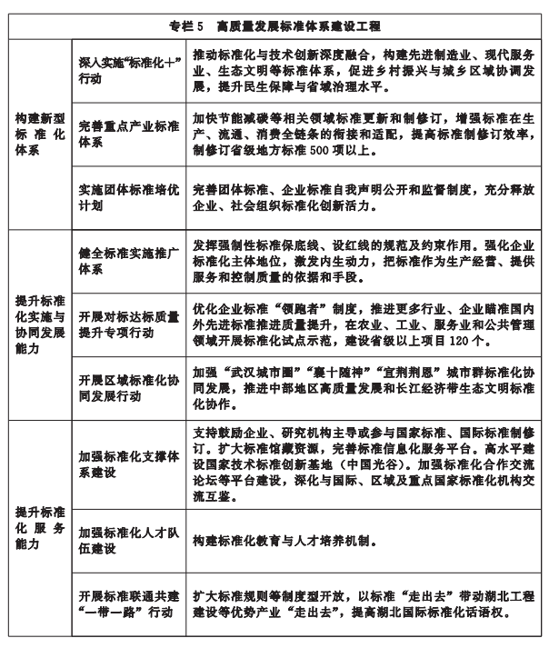 ——質(zhì)量發(fā)展水平躍上新臺(tái)階。質(zhì)量強(qiáng)省戰(zhàn)略實(shí)施成效顯著,標(biāo)準(zhǔn)化綜合改革穩(wěn)步推進(jìn),社會(huì)公用計(jì)量標(biāo)準(zhǔn)體系更加完善,認(rèn)證認(rèn)可檢驗(yàn)檢測(cè)服務(wù)能力明顯提升,基本建成適應(yīng)湖北高質(zhì)量發(fā)展、匹配現(xiàn)代產(chǎn)業(yè)體系的質(zhì)量基礎(chǔ)設(shè)施支撐體系,工業(yè)產(chǎn)品、農(nóng)產(chǎn)品、工程和服務(wù)質(zhì)量全面提升。品牌建設(shè)有力推進(jìn),品牌經(jīng)濟(jì)顯著壯大。