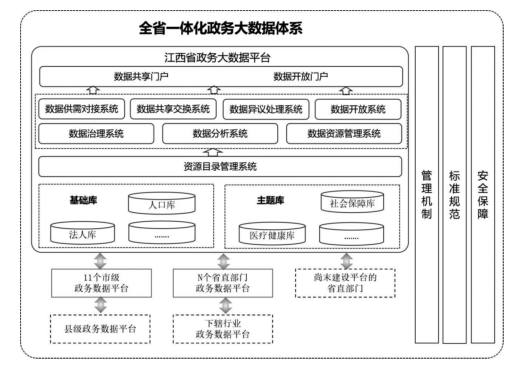 全省一體化政務大數(shù)據(jù)體系包括三類平臺和三大支撐。三類平臺為“1+11+N”架構體系?!?”是指江西省政務大數(shù)據(jù)平臺,是我省政務數(shù)據(jù)管理的總樞紐、政務數(shù)據(jù)交換的總通道、政務數(shù)據(jù)服務的總門戶;“11”是指11個設區(qū)市的市級政務數(shù)據(jù)平臺,負責本級政務數(shù)據(jù)的目錄編制、供需對接、資源管理、共享開放,與省級平臺實現(xiàn)級聯(lián)對接;“N”是指省級政務部門的政務數(shù)據(jù)平臺,負責本部門本行業(yè)數(shù)據(jù)匯聚整合與供需對接,與省級平臺實現(xiàn)互聯(lián)互通。尚未建設政務數(shù)據(jù)平臺的部門,由省級平臺提供服務支撐。三大支撐包括管理機制、標準規(guī)范和安全保障三個方面。