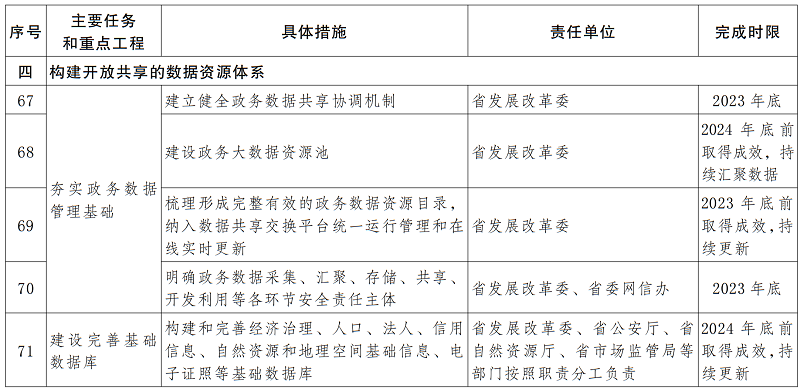 3.數(shù)據(jù)資源體系。健全全省公共數(shù)據(jù)資源目錄,建設(shè)完善數(shù)據(jù)共享交換平臺(tái)、數(shù)據(jù)開放平臺(tái)等設(shè)施;建立健全各類基礎(chǔ)數(shù)據(jù)庫(kù)、業(yè)務(wù)資源數(shù)據(jù)庫(kù)和相關(guān)專題庫(kù),整合、匯聚各類數(shù)據(jù)資源,構(gòu)建全省共建共享的大數(shù)據(jù)資源體系。