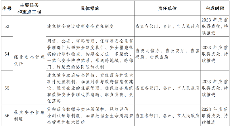 5.安全保障體系。強(qiáng)化安全管理責(zé)任、落實(shí)安全管理制度,統(tǒng)籌建設(shè)網(wǎng)絡(luò)安全、數(shù)據(jù)安全、密碼應(yīng)用等軟硬件設(shè)施和“兩地三中心”容災(zāi)備份系統(tǒng)等安全基礎(chǔ)設(shè)施,筑牢數(shù)字政府建設(shè)安全防線。