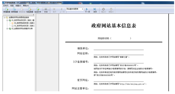 填報單位運行客戶端軟件,打開“政府網(wǎng)站和欄目(系統(tǒng))基本信息表”并新建數(shù)據(jù),填寫政府網(wǎng)站和欄目(系統(tǒng))基本信息并保存。表單所有信息項均為必填項,如確無內(nèi)容請?zhí)顚憽盁o”。